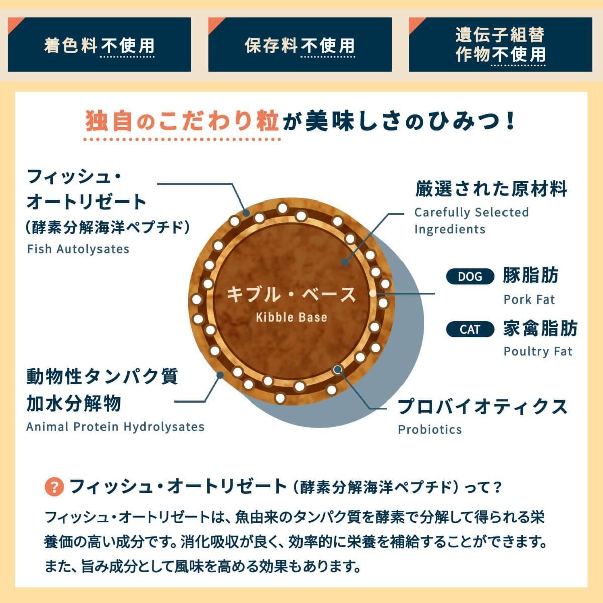 デハイドレイテッドプロテイン(ポーク、チキン、ターキー)、フレンチイエローレッドコーン、小麦、そら豆繊維、豚脂肪、リンゴ繊維、亜麻仁、動物性タンパク加水分解物、ビートパルプ、エンドウ豆、ビール酵母、ベントナイト、海塩、フィッシュオートリゼート(酵素分解海洋ペプチド)、アーティチョーク、フラクトオリゴ糖、ビタミン類(A、B1、B2、B6、B12、ナイアシン、ビオチン、塩化コリン、パントテン酸カルシウム、ビタミンC誘導体、D3、E、葉酸、メナジオン重亜硫酸ナトリウム複合体)、ミネラル類(キレート亜鉛、硫酸亜鉛、酸化マンガン、セレン酵母、硫酸銅、キレート銅、ヨウ素酸カルシウム、亜セレン酸ナトリウム)、L-カルニチン、乳酸菌(エンテロコッカス・フェシウム)、ローズマリー抽出物、酸化防止剤(ミックストコフェロール、クエン酸
