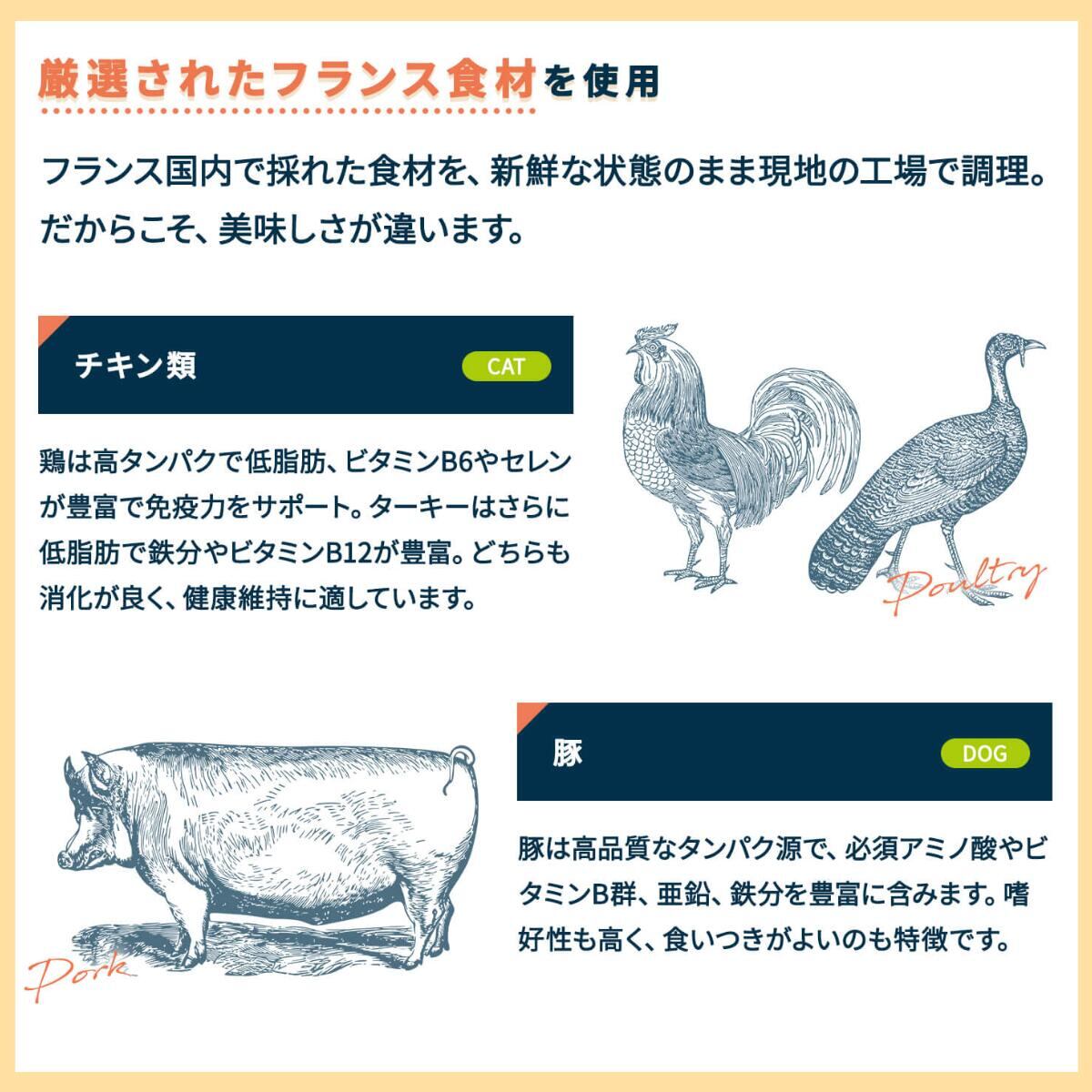 デハイドレイテッドプロテイン(ポーク 、チキン、ターキー)、フレンチイエローレッドコーン、米、豚脂肪、リンゴ繊維、デハイドレイテッドフィッシュ、亜麻仁、動物性タンパク加水分解物、ビール酵母、ココナッツオイル 、ベントナイト、全卵、 魚油、フィッシュオートリゼート(酵素分解海洋ペプチド)、サイリウム繊維、ビタミン 類(A、B1、B2、B6、B12、ナイアシン、ビオチン、塩化コリン、パントテン酸カルシウム、ビタミンC誘導体、D3、E、葉酸、メナジオン重亜硫酸ナトリウム複合体)、海塩、フラクトオリゴ糖、ミネラル類 (キレート亜鉛、硫酸亜鉛、酸化マンガン、硫酸銅、セレン酵母、キレート銅、ヨウ素酸カルシウム、亜セレン酸ナトリウム)、 酵母抽出物(サッカロマイセス・セレビシエ、サイバーリンドネラ・ジャディニー)、乳酸菌(エンテロコッカス・フェシウム)、ローズマリー抽出物、酸化防止剤(ミックストコフェロール、クエン酸)