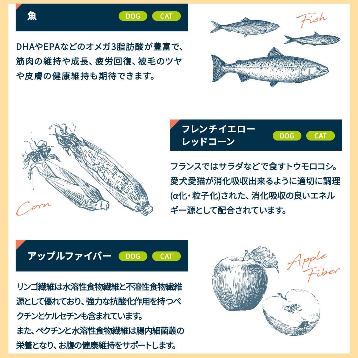 デハイドレイテッドプロテイン(チキン、ポーク、ターキー)、フレンチイエローレッドコーン、小麦、豚脂肪、亜麻仁、リンゴ繊維、エンドウ豆、ビートパルプ、動物性タンパク加水分解物 、そら豆繊維、ビール酵母、ベントナイト、海塩、フィッシュオートリゼート(酵素分解海洋ペプチド)、フラクトオリゴ糖 、ビタミン類 (A、B1、B2、B6、B12、ナイアシン、ビオチン、塩化コリン、パントテン酸カルシウム、ビタミンC誘導体、D3、E、葉酸、メナジオン重亜硫酸ナトリウム複合体)、ミネラル類(キレート亜鉛、硫酸亜鉛、酸化マンガン、セレン酵母、硫酸銅、キレート銅、ヨウ素酸カルシウム、亜セレン酸ナトリウム)、乳酸菌(エンテロコッカス・フェシウム)、ローズマリー抽出物、酸化防止剤(ミックストコフェロール、クエン酸)