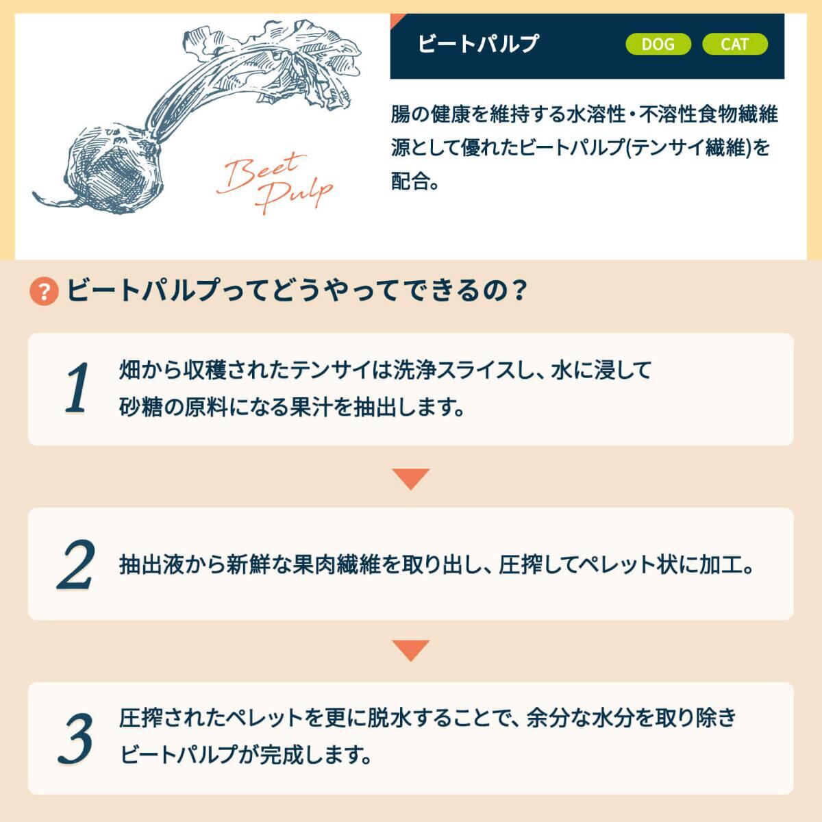 粗タンパク質:27%以上、粗脂質:12%以上、粗繊維質:5%以下、水分:9%以下、粗灰分:6%以下、カルシウム:1.1%、リン:0.6%、ナトリウム:0.15%.、カリウム:0.45%、マグネシウム:0.13%、オメガ6:2%、オメガ3:1.4%、カロリー351kcal/100g