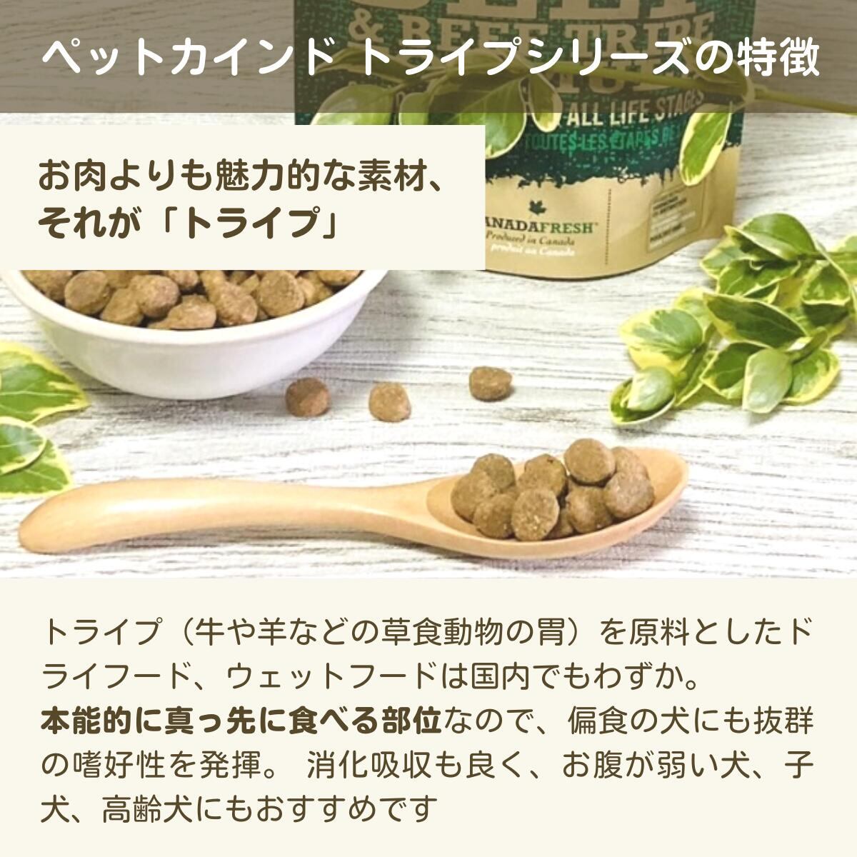犬の本能に働きかける嗜好性抜群のドッグフード。 動物性タンパク源をビーフのみに限定しており食物アレルギーにも配慮。グレイン&グルテン不使用、注目素材「キノア」配合。 グリーントライプには犬に必要なアミノ酸、必須脂肪酸、ビタミン、ミネラルが豊富に含まれています。シリーズ初めてのアレルギー対応シングルプロテインのドライフード。 グレイン&グルテン不使用、家禽類不使用、グリーントライプには犬に必要なアミノ酸、必須脂肪酸、ビタミン、ミネラルが豊富に含まれています。飼い主の皆様・愛犬にお喜びいただける無添加で安心なドッグフードですです。