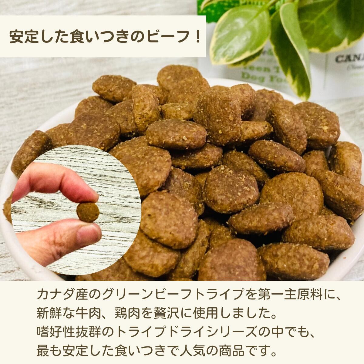 グリーントライプの成分はワイルドサーモン(カナダ産)とグリーンラムトライプ(ニュージーランド、カナダ産)のオーガニック・キヌア(カナダ・ペルー産)です。飼い主の皆様・愛犬にお喜びいただける無添加で安心なドッグフードですです。